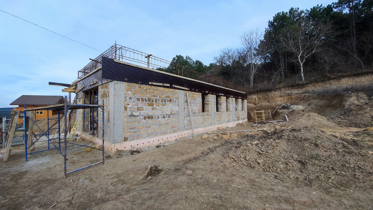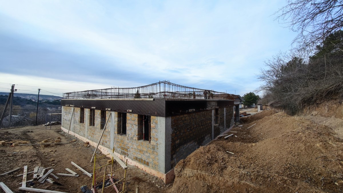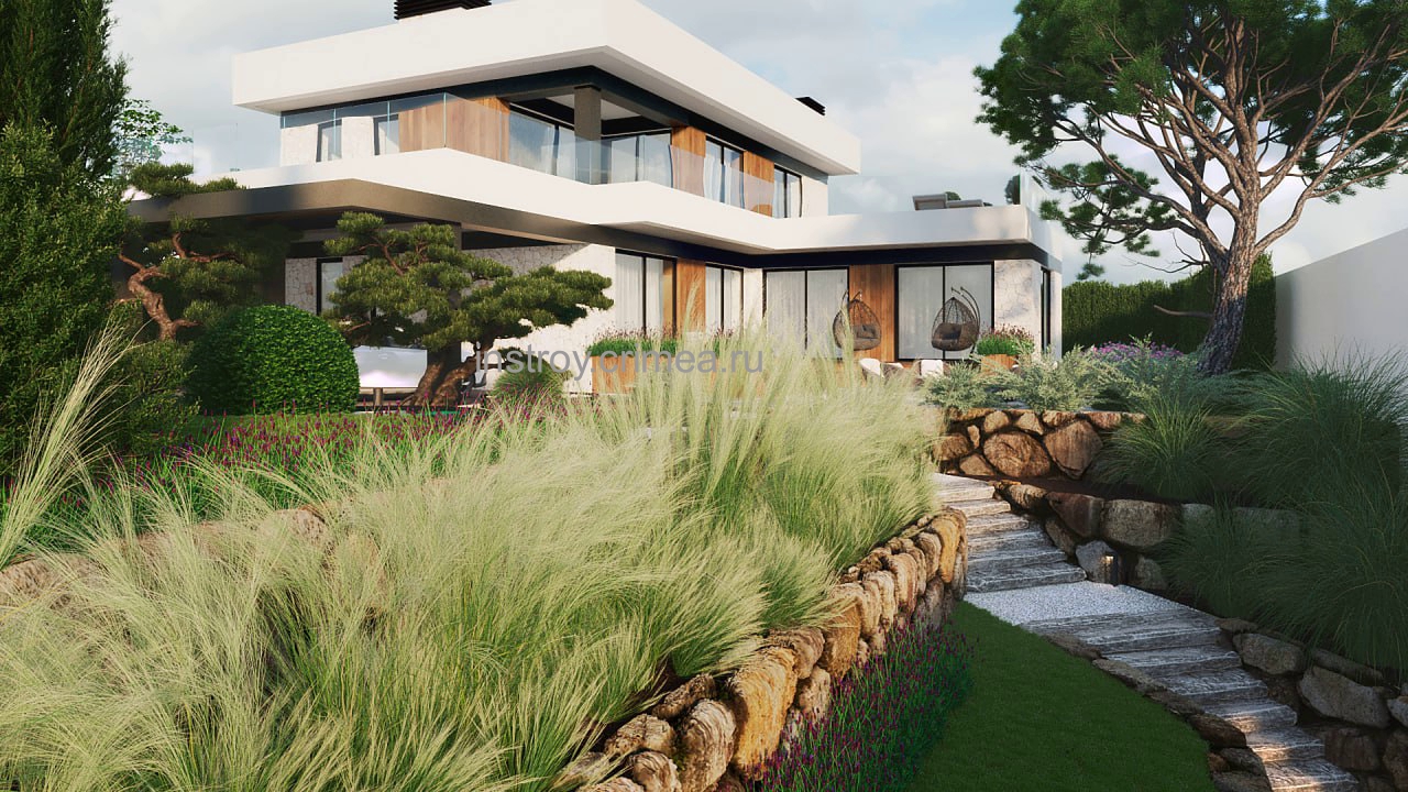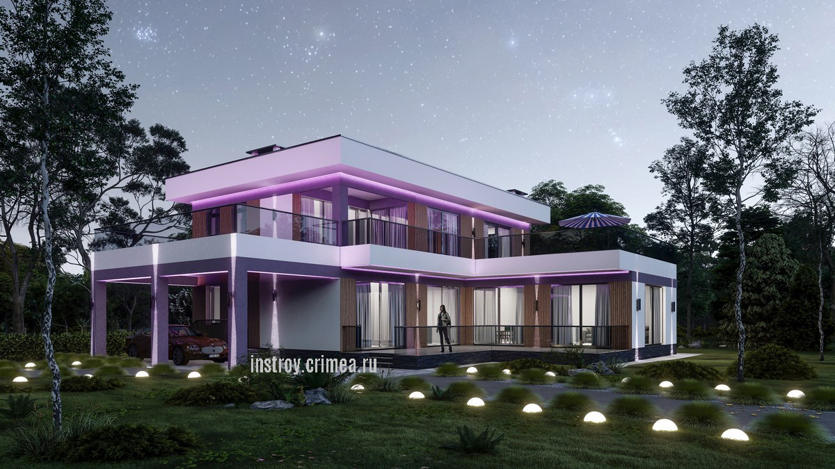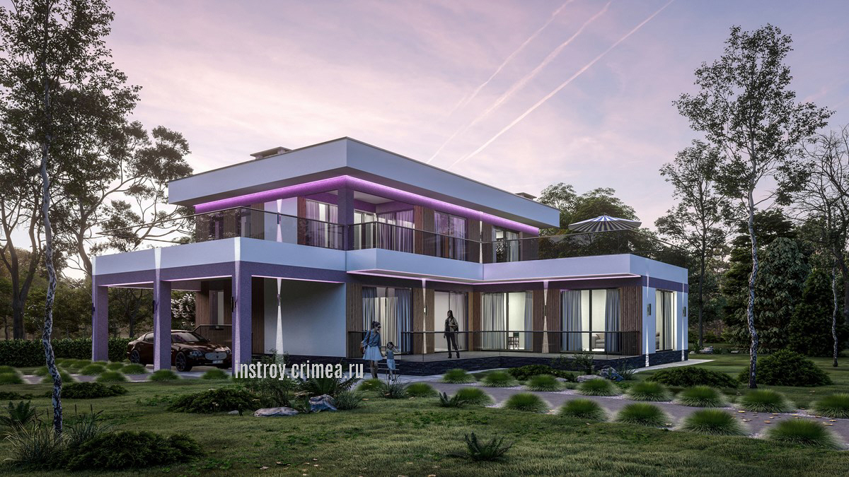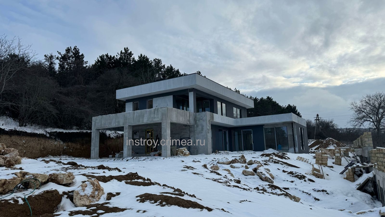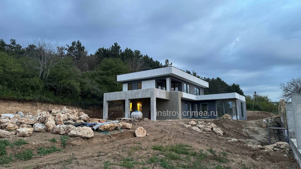 Проектная группа Симферополя ИНстрой представляет проект двухэтажного жилого дома, в современном стиле хай-тек с плоской крышей, 18 на 16 м., 242 м2 для строительства в Симферопольском р-не, с. Лозовое, ул. Подгорная. Каркасно-каменный монолитный каркас. Несущие наружные стены из известняка-ракушечника. Перегородки - газобетонные блоки, монолитные перекрытия, монолитные ленточные фундаменты. Кровля - плоская, ПВХ мембрана. Рассчитан на сейсмичность 8 баллов.